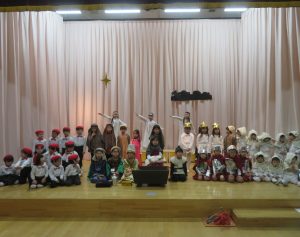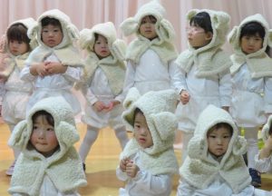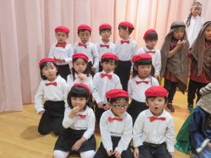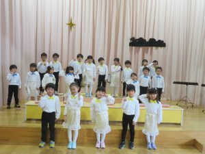ちゅうりっぷ組は聖歌隊を、すみれ組の2歳児は羊役になりきって参加しました。