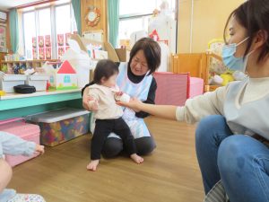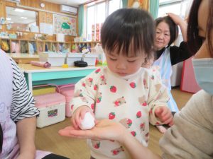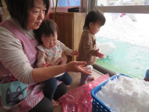 冷たくてびっくりして泣き出す子もいましたが、お外に作ってくれた雪だるまを見て嬉しそうにしていました。少しずつ慣れて楽しめるようにしていきたいと思います!!