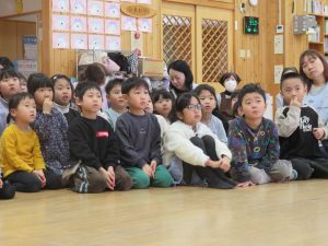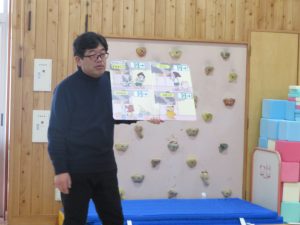 ホールに避難して園長先生と火災が起きた時の避難の仕方をポケモンのイラストを見ながら再確認することができました。