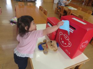 〇郵便ごっこが今週から始まり、お家の人やお友だちにハガキを描いてポストに投函しました。📮子どもたちからのお手紙をお楽しみに‥‥